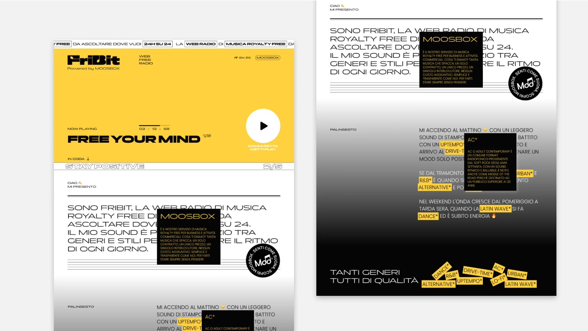 Abbiamo lanciato Fribit con una landing page viva dove ogni scelta visiva, ogni parola, fa suonare l’identità di una radio che accompagna l’utente nel mondo musicale di MoosBox.